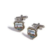 - cufflinks made of hand-painted fire enamels, e.g.with a London theme featuring a flag on one cufflink and a soldier on horseback on the other